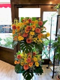 大人気のスタンド花の二段タイプです。 こちらは明るいイエローオレンジ系でお作りしています。 明るく元気な印象の色なので、御祝い事に人気です! 男性女性関係なく人気のお色です♪ 開店祝や出演祝いにいかがでしょうか? ※画像はイメージです。